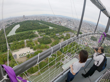 世界遺産「百舌鳥・古市古墳群」(大阪府)のうち、国内最大の前方後円墳である大山古墳(仁徳天皇陵古墳)を望むことができるガス気球の運航開始を翌日に控え、試乗会が行われた=3日午後、堺市 【時事通信社】