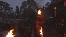 稲美町の高薗寺(稲美町野寺)で2月7日・8日、2体の鬼が火のついたたいまつを投げ入れる伝統行事「鬼追式」が行われた。