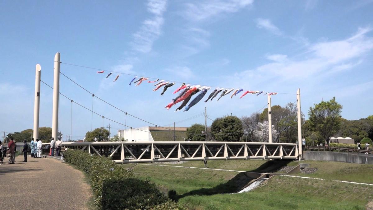 「ふるさと橋」の上空には30匹のこいのぼりがゆらゆら泳ぐ