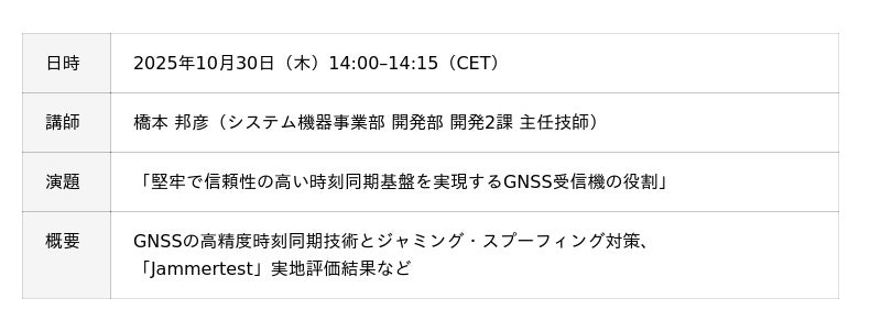 近年、さまざまな代替手段が提案されていますが、GNSSを完全に凌駕する技術はなく、それぞれに長所と短所が存在します。そのため、従来重視されてきた高感度性能に加えて、時刻精度の維持や適切なハンドオーバー機能など、より高度な性能が求められています。こうした背景を踏まえ、今回の技術セッションでは、「堅牢で信頼性の高い時刻同期基盤を実現するGNSS受信機の役割」について当社技術者が講演します。GNSS受信機に求められる性能要件を整理するとともに、ノルウェーで実施された実地テスト「Jammertest」の評価結果についても発表する予定です。