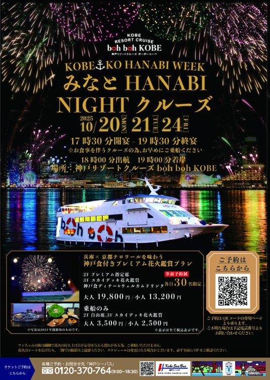 10月23日開催の「船上料亭クルーズ」のみならず、boh boh KOBEでは「みなとHANABI」に合わせた特別クルーズプラン『神戸みなとHANABI NIGHTクルーズ』を販売しております。ぜひ10/23にご都合がつかないお客様は10月20日、21日、24日の3日間にも花火クルーズを行いますので、ご予約をお待ちしております!