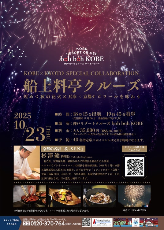 神戸シーバスboh boh KOBEは、2025年10月23日(木)、「煌めく秋の花火と兵庫×京都のテロワールを味わう-」と題して、「みなとHANABI 2025 - 神戸を彩る5日間 -」に至高の日本料理をかけ合わせた特別クルーズ「船上料亭クルーズ2025」を開催いたします!