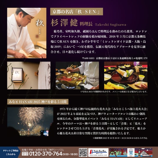 10/23★神戸シーバス boh boh KOBE★ミシュラン1つ星・京都の日本料亭「?叩-SEN-」杉澤 健 料理長が船上で本格日本料理を振る舞う「船上料亭クルーズ2025」開催!