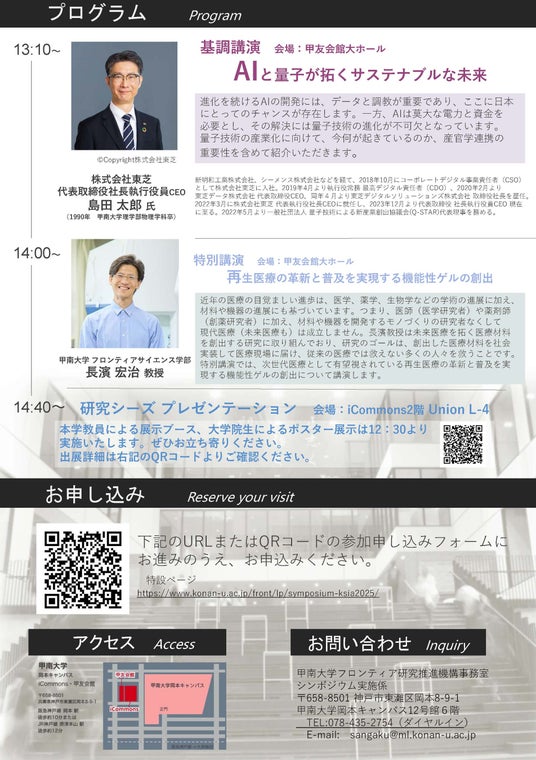 2023年の開催に続く第2回目の今回は、基調講演では本学卒業生の株式会社東芝 代表取締役社長執行役員CEO 島田太郎氏(1990年甲南大学理学部物理学科卒)にご登壇いただきます。そのほか、本学教員による特別講演や研究シーズプレゼンテーション、ブース展示、未来の研究者を志す本学大学院生によるポスター展示を実施します。