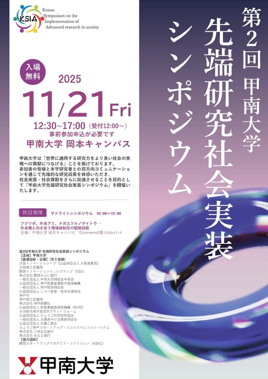 甲南大学(兵庫県神戸市/学長:中井伊都子)は、「世界に通用する研究力をより良い社会の実現への貢献につなげる」ことを掲げています。参加者の皆様に先端的な研究成果を体感していただき、本学の研究者との双方向コミュニケーションを通じて、社会実装・社会貢献をさらに加速させることを目的として、甲南大学先端研究社会実装シンポジウム(Konan Symposium on the Implementation of Advanced research in society、以下KSIA)を開催いたします。