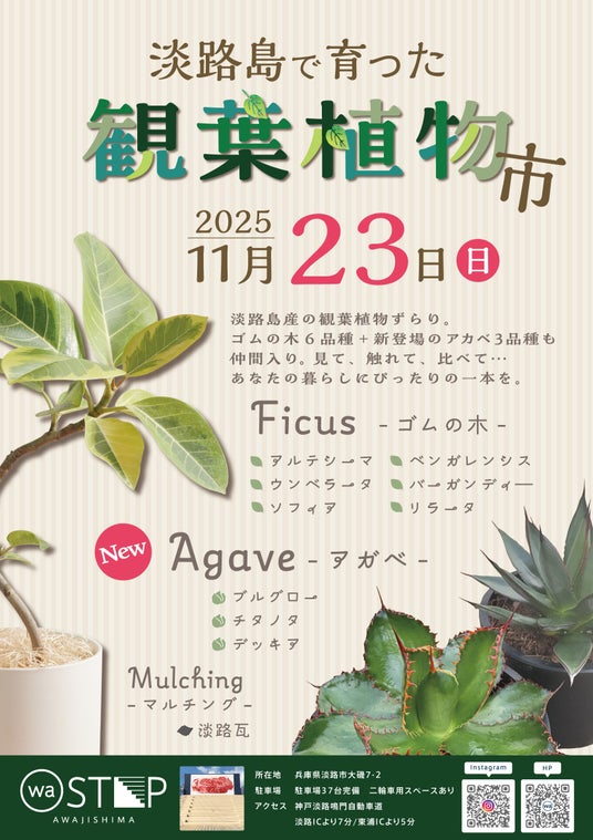 淡路ハイウェイオアシスなどを運営する、ユーアールエー株式会社(所在地:兵庫県淡路市大磯6番地)が、 淡路島東海岸で2023年グランドオープンした、淡路島のいいところ、おいしいものをぎゅっと集めた大型総合ショッピングゾーン『waSTEP AWAJISHIMA』では、2025年11月23日(日)10時~16時まで、“淡路島で育った観葉植物市” を開催します。